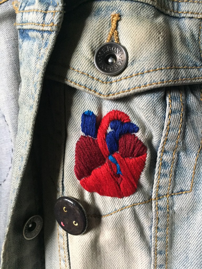 [Featured below] are two “starter” embroidery pieces I found patterns for, and I decided to try my hand at embroidery as an outlet for some stress and anxiety during my second year. I learned to sew from both of my grandmothers and how to cross stitch from my mom at a very young age, and in college I did some free-hand embroidery on a jean jacket I wore all of the time. I got tons of compliments on the anatomical heart and eye that I did on my jacket, and found that embroidery was similar to basic sewing, but with so much more of an artistic flair. It is basically painting, but instead of using paint, you create the color and texture using embroidery floss (fancy thread). Embroidery can be very difficult, but the finished pieces are so beautiful and satisfying that it more than makes up for the time I spent on them and the number of times I stabbed myself with needles!