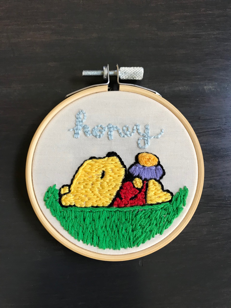 The pattern I most enjoy designing are floral patterns in these adorable three-inch frames I found online. I made the First Bouquet in early spring of this year, and it hangs on the wall in my room. This was the project that inspired me to make more floral designs. I gifted The First Flower Basket to my wonderful aunt who lives in Pakistan. Happy Birthday, Tehrim is a piece I made for my best friend; who also happens to be my sister-in-law. I gave Pink and Maroon to a kind and fun friend from work. Honey for Pooh Bear is the first cartoon pattern I attempted, and I am pretty happy with the result. This one hangs on the wall in my room as well.
